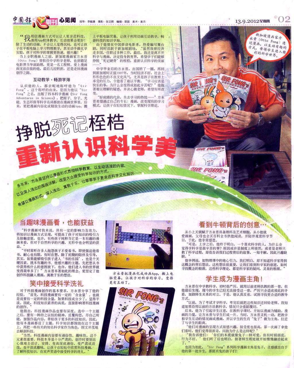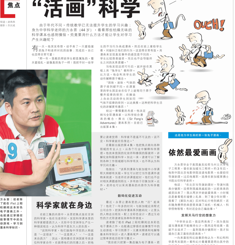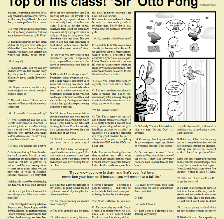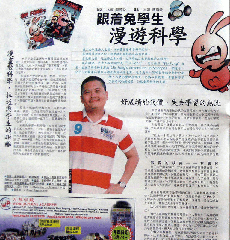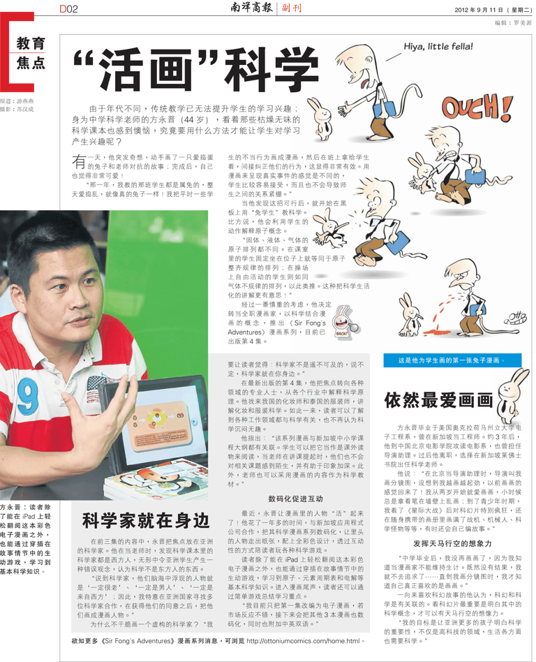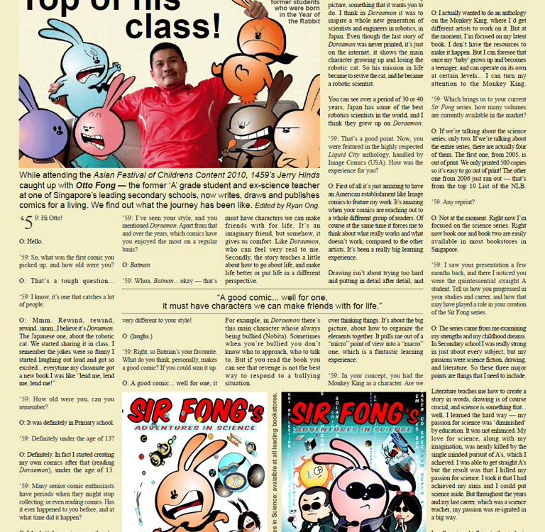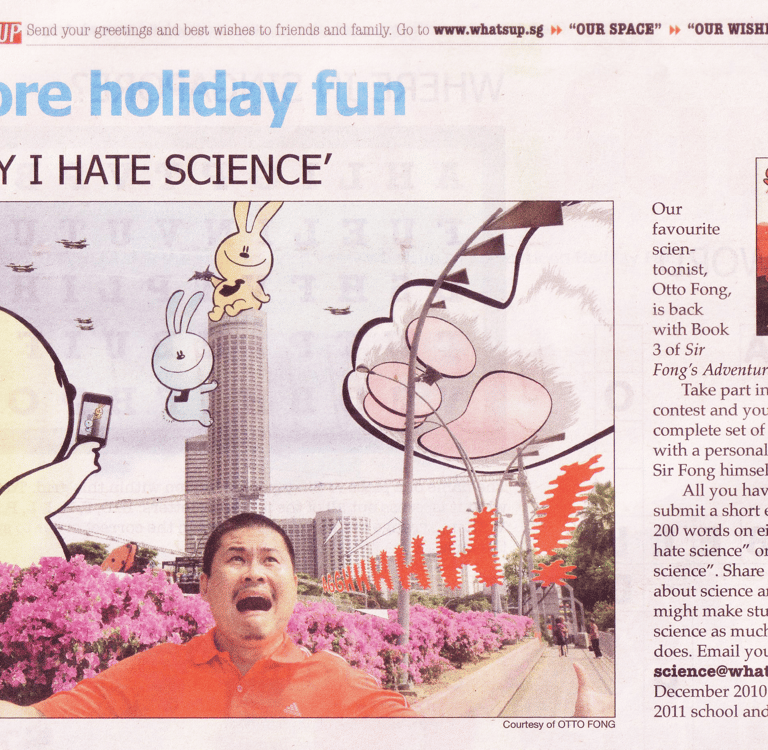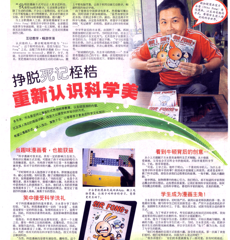 In an interview with The Straits Times, Otto Fong introduces his sixth book of the Sir Fong's Adventures In Science series, a collaboration with the National University of Singapore's SynCTI. He explains how he (in the story) tackles complex debates about synthetic biology, such as whether to bring extinct animals like dinosaurs, back to life or focus on protecting animals that may go extinct in our lifetime. The print edition of this article can be seen in The Straits Times on September 08, 2017, with the headline as 'Comic-Stripping Science of its Mysteries'.