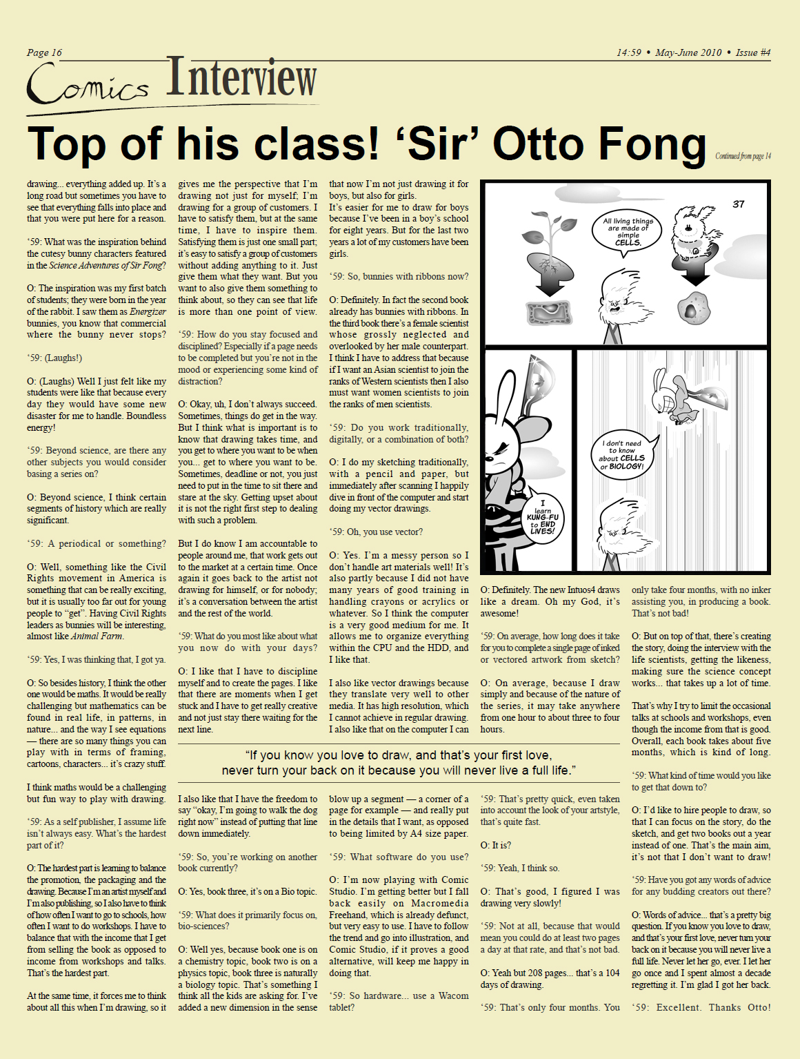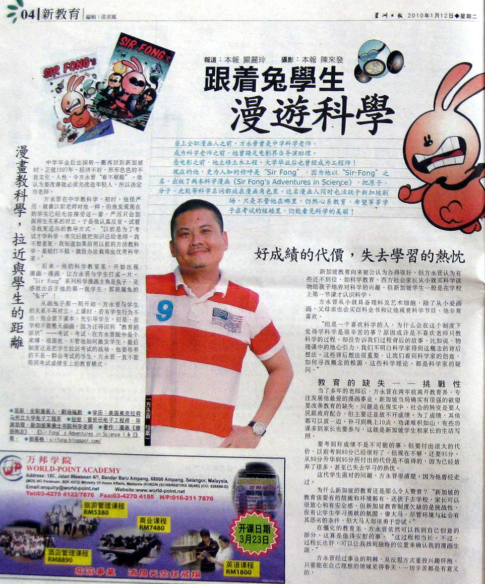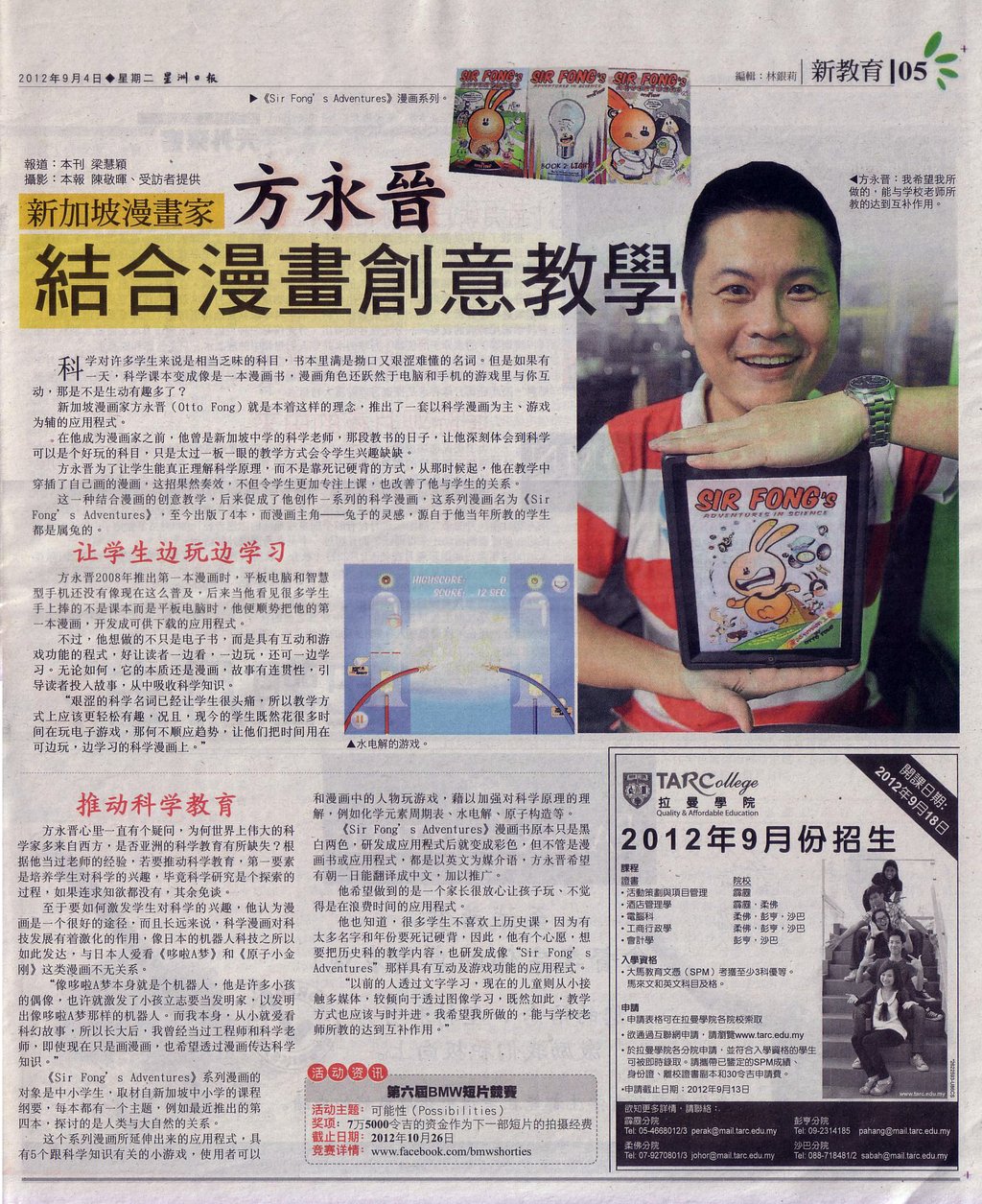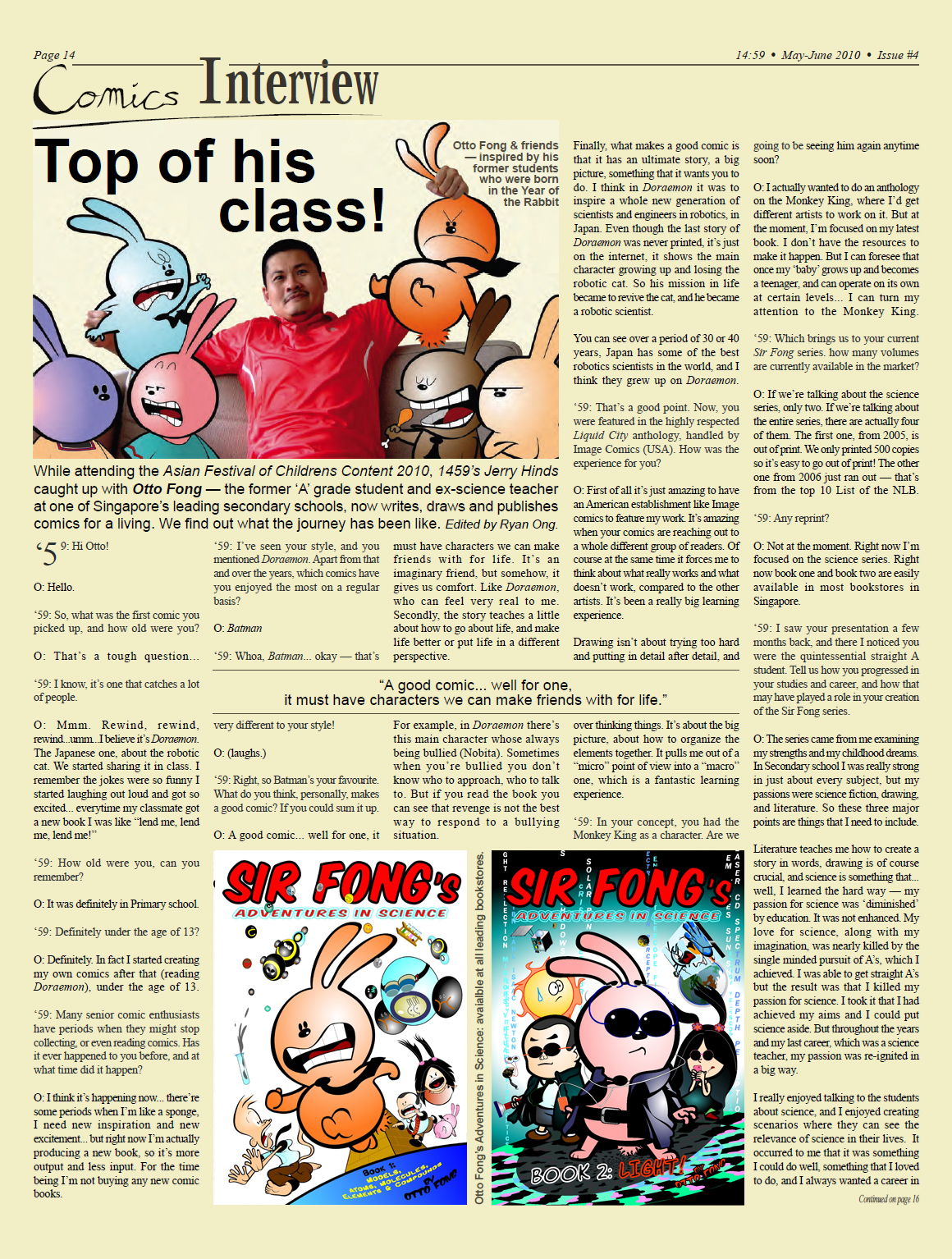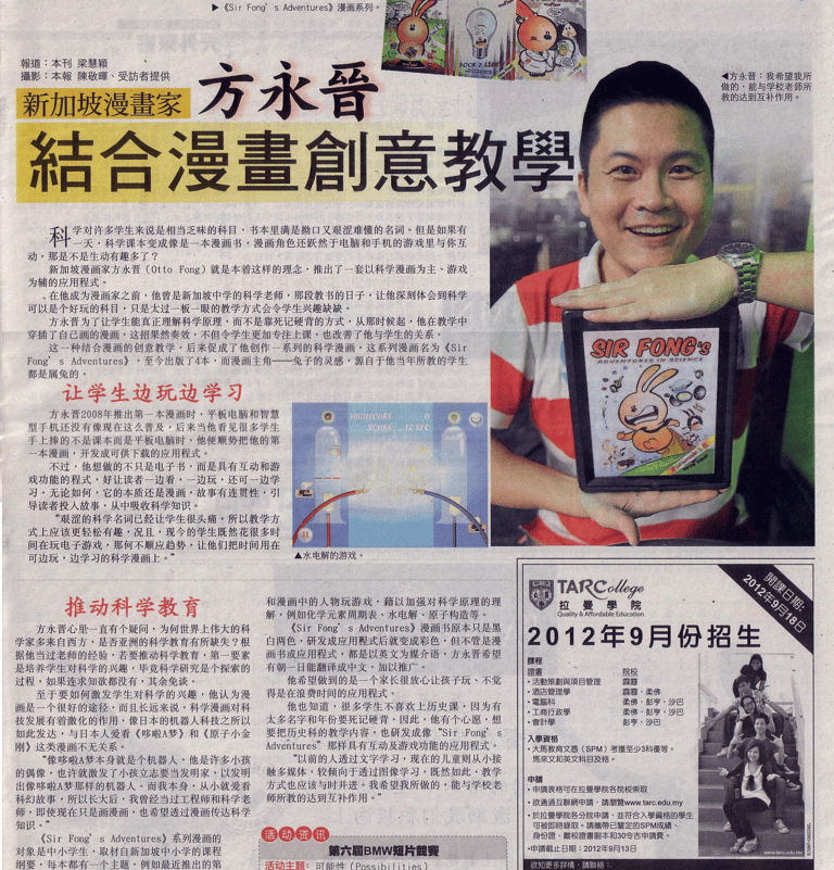 In an interview with The Straits Times, Otto Fong introduces his sixth book of the Sir Fong's Adventures In Science series, a collaboration with the National University of Singapore's SynCTI. He explains how he (in the story) tackles complex debates about synthetic biology, such as whether to bring extinct animals like dinosaurs, back to life or focus on protecting animals that may go extinct in our lifetime. The print edition of this article can be seen in The Straits Times on September 08, 2017, with the headline as 'Comic-Stripping Science of its Mysteries'.